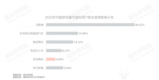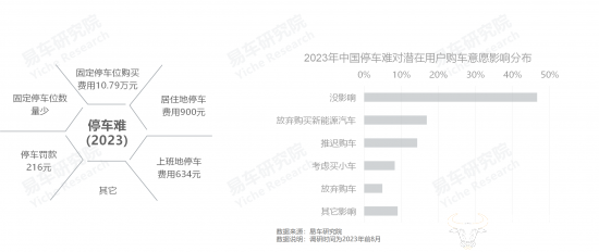易车研究院基于2023年前8月潜在购车用户调研发现,“停车难”冲击53.38%潜在用户的购车意向,影响广度远大于一线城市的汽车限购政策;