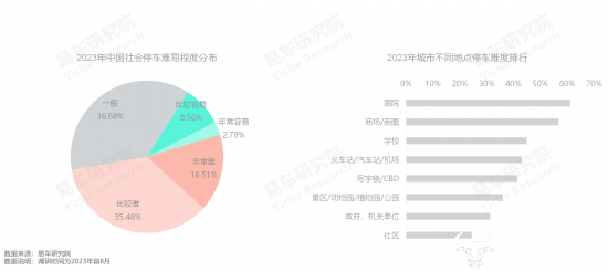 2023年,51.99%的用户认为所在城市“停车难”,其中16.51%认为非常难,医院、商圈、学校、车站等位居“停车难”前列;