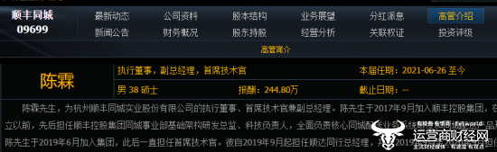 2019年6月,顺丰同城独立出来,他便担任公司首席技术官一职。当时,他才34岁,提拔的算是比较早的。同年9月,他开始兼任顺达同行总经理,2021年,他被聘任为公司执行董事、副总经理。