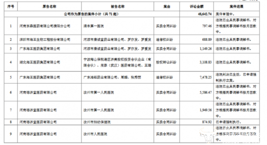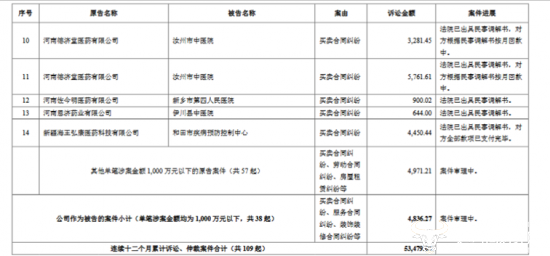 在披露的14项金额较大的诉讼案件中,有10项是与公立医疗机构之间的买卖合同纠纷,涉及金额超3亿元。有三笔超五千万元,最高单笔为与汝州市人民医院的纠纷,超7000万。