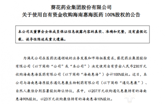 近日,葵花药业拟用自有资金230万元收购海南惠海医药的消息引发行业关注。具体是什么情况呢?