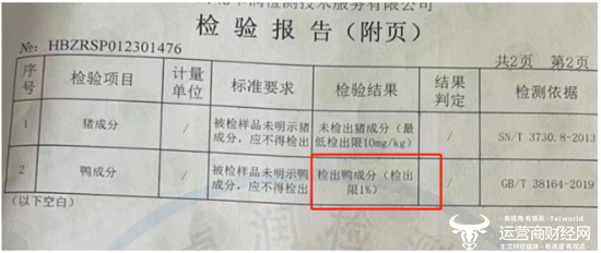 据该博主在社交平台上发布的信息表示,其购买的6盒肉类食材当中,4盒高钙羊肉卷被检测机构检测出鸭成分。