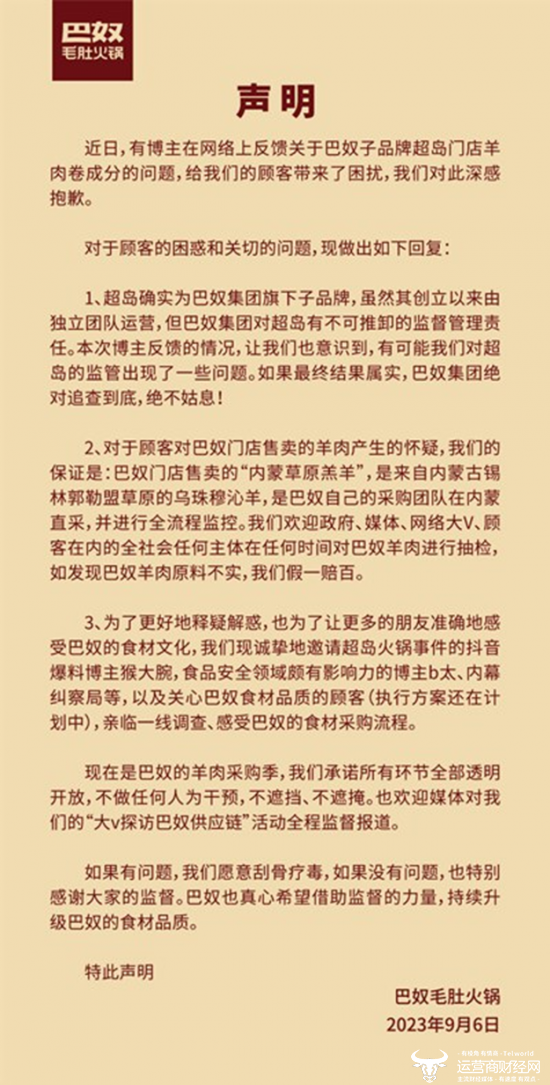 而针对此事,巴奴火锅方也发布了一份声明,表示超岛确实是巴奴集团旗下的子品牌,其对超岛有不可推卸的监督管理责任。对于羊肉卷真假的问题,巴奴火锅表示该羊肉是出自真羊,即内蒙古锡林郭勒盟草原的乌珠穆沁羊身上的,且整个直采全流程都有进行监控。