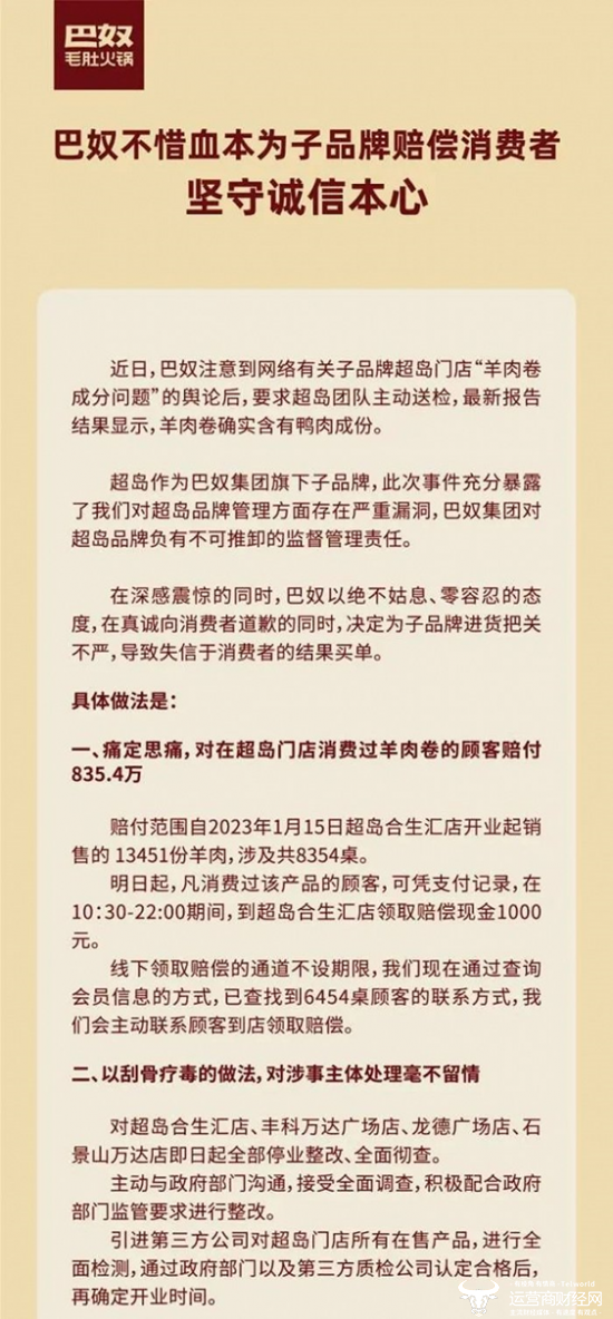 据最新巴奴最新回应表示,超岛所售的羊肉卷确实含有鸭肉成分。对此,巴奴方表示“不惜血本”为超岛赔偿消费者,决定对在超岛门店消费过羊肉卷的顾客赔付835.4万元,并对相关门店全部停业整改。