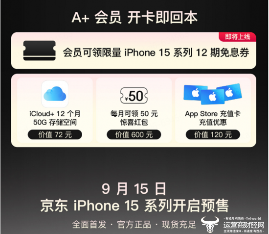 最重磅的是,99元开通京东A+会员可提前锁定iPhone 15系列优先必购权、限量12期免息、还免费赠送价值72元的12个月50GB iCloud云存储空间、每月App Store充值卡10元红包、上百款苹果产品专享低价等权益,开卡即一单回本。此外,京东即时零售平台业务京东到家也将同步开启即时零售新机预售,联合全国超4600家Apple授权专营店,现货充足,保障开售后现货小时级最快分钟级送达,实现配送时效再升级。