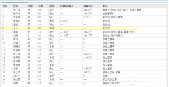 由于王平是今年新任副总裁,所以官方暂未披露其薪酬信息。不过,与王平一同被聘任为副总裁的还有尹先知、刘联、康波、黄其忠、申薇。其中,尹先知担任副总裁兼非独立董事;申薇担任副总裁、非独立董事兼董事会秘书;刘联担任副总裁兼财务负责人。他们三人的薪酬分别为71.21万元、151.1万元、141.7万元。而同为副总裁的黄其忠持股3.500万元,康波是博士。