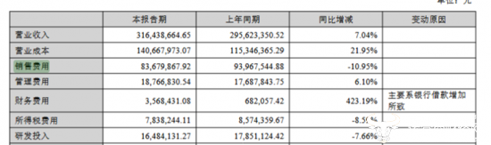 报告期内公司财务费用翻倍增长,主要系银行借款增加所致。销售费用及研发投入与上年同期相比都有所下降,金额分别为8367.99万元、1648.41万元。研发远不及销售投入。
