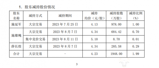 值得注意的是,股东施延军及其一致行动人施雄飚、薛长煌在今年8月7日到8月11日,已合计减持公司股份数量达到978.7万股,占了公司总股本的1%。而在此前,在今年7月25日,施延军个人减持公司978万股。前后两次减持均价为4.23元每股,合计减持总金额达到了8240万元。