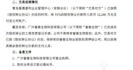 截至目前,普晟普利已将其中51%的股权转让价即1.224亿支付给誉衡药业,誉衡生物已完成股权转让的工商变更。根据约定,普晟普利将持有的誉衡生物的全部股权质押给誉衡药业,用以担保其剩余股权转让价款的支付义务。