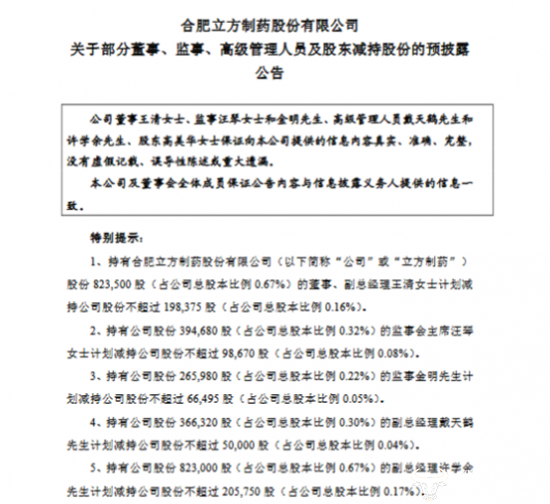 此前,立方制药发布公告称,公司副总经理王清、戴天鹤、许学余拟以集中竞价的交易方式分别减持公司股票不超过19.84万股(占公司总股本比例 0.16%)、不超过5万股(占公司总股本比例0.17%)、不超过20.575万股(占公司总股本比例0.17%),减持区间为今年6月12日至12月9日。对于他们减持股票的原因,立方制药在公告中表示是其自身资金需要。