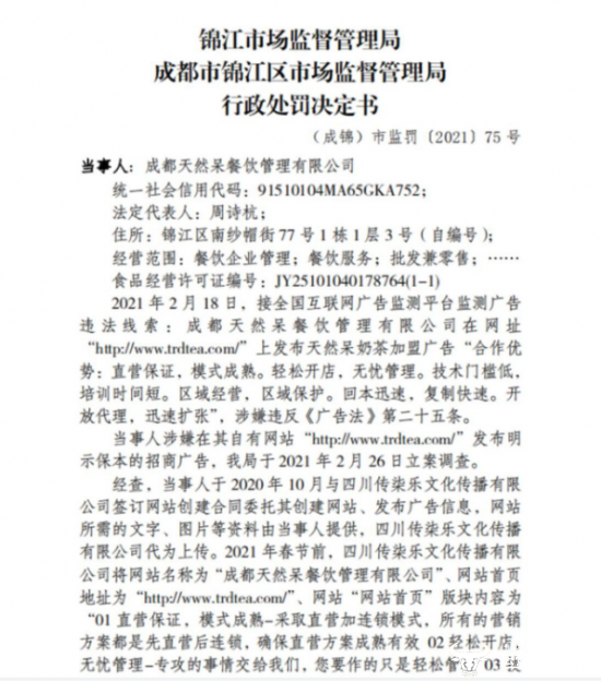 此前,天然呆还被锦江市场监督管理局罚款5万元,原因是在其网站上发布“快速回本”“轻松管理”等,招商有投资回报预期的服务广告。