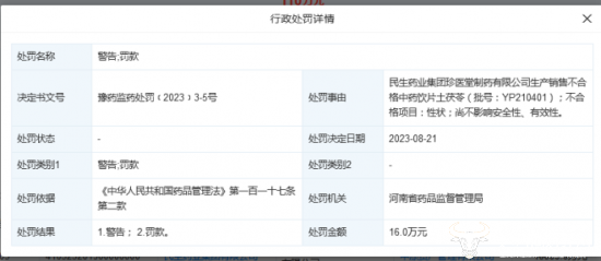 运营商财经网查阅天眼查发现,民生药业集团有限公司的全资控股子公司珍医堂制药于前不久新增一条行政处罚信息,行政处罚决定书文号为豫药监药处罚(2023)3-5号。