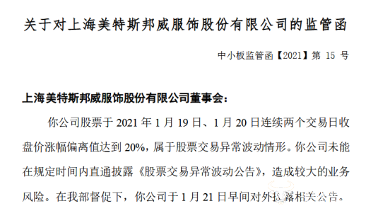 彼时,美邦服饰的股票在1月19日及20日连续两个交易日收盘涨幅偏离值达到20%,属于股票交易异常波动情形,但公司并未在规定时间内披露相关波动公告,造成较大业务风险,因此,被中小板公司管理部出具了监管函。