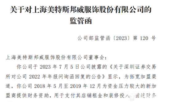 据深交所下发的监管函内容显示,美邦服饰于今年7月5日披露了《关于深圳证券交易所对公司2022年年报问询函回复的公告》,相关内容表示,为拓宽加盟渠道,美邦服饰于2018年5月至2019年12月为资金压力较大的新加坡加盟商提供财务资助,用于支付其店铺租金和装修投入。