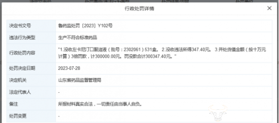 因此,山东省药监局对其处以了没收左卡尼汀口服溶液(批号:2302061)531盒、没收违法所得347.4元,并处货值金额3倍的罚款,计30万元。