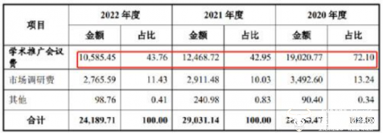 而其高销售费用的背后是其超高的市场及学术推广费,其中学术推广会议费三年分别花费1.90亿元、1.25亿元及1.06亿元,三年累计召开的学术会议超3000场。就单独来看2022年,当年召开学术会议751场,平均每月召开62场,均场费用高达14万多,这真的合理吗?