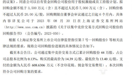 据了解,此次回购公司股份的拟回购金额为不低于3500万元且不超过7000万元。截至9月27日,公司已经通过集中竞价交易方式已经累计回购股份44万股,占公司总股本比例为0.13%,所支付的金额为608.6306万元。