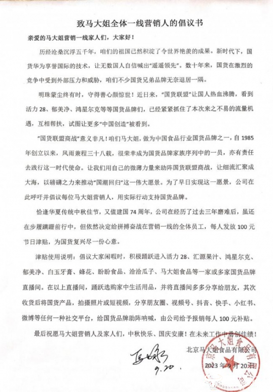 近期,一份马大姐食品呼吁员工支持国货的内部通知引发不少消费者热议,作为知名国货品牌,马大姐此番举动让众人直呼其身为国货品牌的担当。对此,公司CCO杨学宝表示,这是为了让每个马大姐人,都用行动助力国货品牌的更高价值。