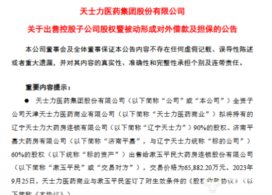 9月25日晚,天士力发布公告称,公司全资子公司天津天士力医药商业有限公司拟将持有的辽宁天士力大药房连锁有限公司90%股权及济南平嘉大药房有限公司60%的股权出售给漱玉平民大药连锁股份有限公司。交易金额约6.59亿元,其中辽宁天士力90%股权约5.04亿元,济南平嘉60%股权约1.54亿元。