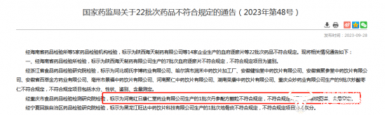 9月28日,国家药品监督管理总局发布一则关于22批次药品不符合规定的通告(2023年第48号),其中就涉及到了红日药业旗下一孙公司。