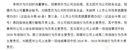 因此,董事长李林、总经理倪兼明、财务总监吴玉妮、董秘杨璐及时任财务总监刘婉雯作为上述事件的相关责任人,与天创时尚一起被广东证监局采取了出具警示函的行政监管措施。