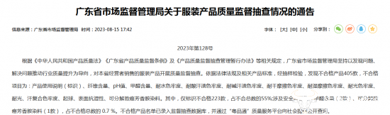 今年8月15日,广东省市场监督管理局发布了一则关于服装产品质量监督抽查情况的通告,内容显示,广东省市监局对本省经营者销售的服装产品开展了质量监督抽查,经抽样检验,发现不合格产品有405款,不合格项目包含产品适用说明(标识)、纤维含量、PH值、甲醛含量、耐水色牢度等。