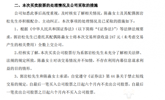公司对此表示,已对该此事采取相关措施,并表示此次买卖公司股票行为系郭岩松未充分了解相关法律、法规的规定所致,陈淼对该交易情况并不知情,不存在利用内幕信息谋求利益的目的情形。