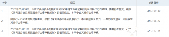 据深交所官网显示,此次并不是幺麻子第一次被中止上市审核,此前在3月31日,公司也因IPO申请文件中记载的财务资料已过有效期,需要补充提交而被中止,但因公司在6月27日成了财务资料更新,上交所又恢复了其上市审核。