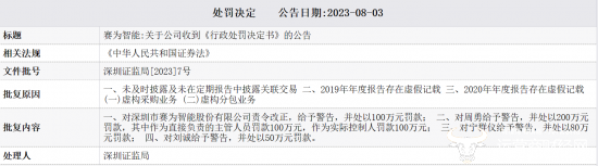除了业务,赛为智能在其他方面也是麻烦不断。8月3日,公司收到深圳证监局发布的行政处罚,由于年报虚假记载等原因,被责令改正,给予警告,罚款100万。