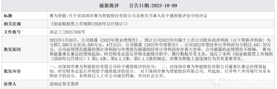 近日,深交所发布公告,深圳市赛为智能股份有限公司及其相关当事人被给予通报批评的处分。原因是在今年年初发布的2022年公司业绩预告中,对年度净利润的亏损预告不准确。赛为智能的公司以及董事长、财务总监都被给予了通报批评的处分。