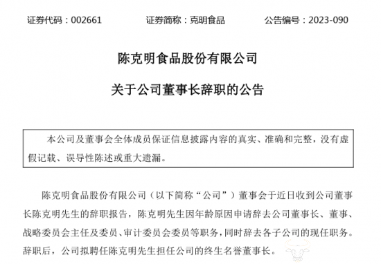 据克明食品10月18日公告表示,公司董事会于近日收到公司董事长陈克明的辞职报告,陈克明因年龄原因申请辞去公司董事长、董事、战略委员会主任及委员、审计委员会委员等职务,同时辞去各子公司的现任职务。