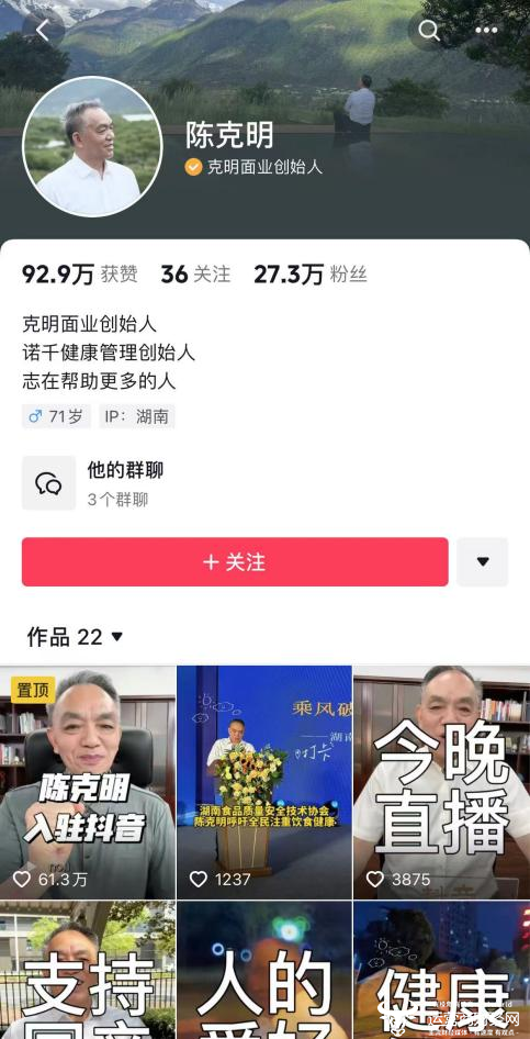 据其抖音个人主页上的简介表示,他的身份是克明面业创始人和诺千健康管理创始人。