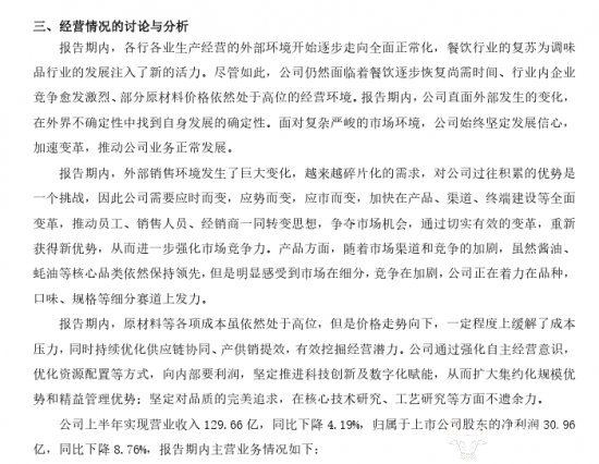 而在业绩方面,海天味业近期业绩也不甚理想。据公司8月30日所发布的半年报显示,上半年公司实现营业收入129.66亿元,同比下降4.19%,归属于净利润30.96亿元,同比下降8.76%,“增幅”是同期财报中的上市以来最差。