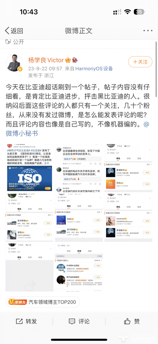 杨学良的文案内容是:今天在比亚迪超话刷到一个帖子,帖子内容没有细看,是肯定比亚迪进步,抨击黑比亚迪的人。很纳闷后面这些评论的人都只有一个关注,几十个粉丝,从来没有发过微博,是怎么能发表评论的呢?而且评论内容也像是自己写的,不像机器编的。