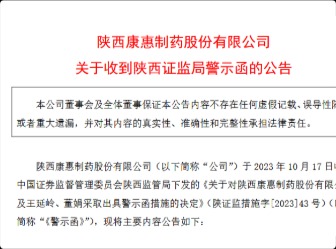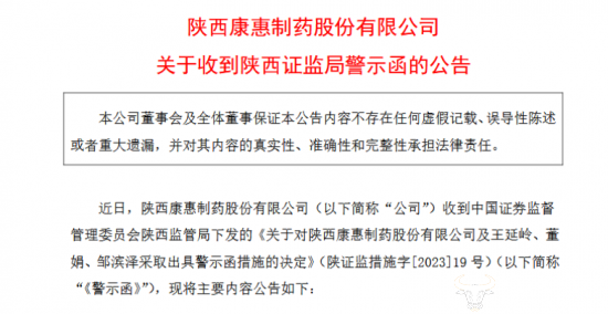 而结果是,今年6月16日,康惠制药发布了一则关于收到陕西证监局警示函的公告,内容显示,公司及董事长王延岭、董事会秘书董娟及财务总监邹滨泽因2022年度的业绩预告及更正公告相关信息披露不准确,被陕西证监局采取了出具警示函的行政监管措施。