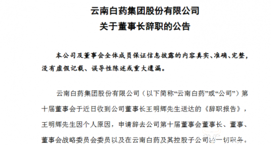 今年3月6日,云南白药发布公告称,于近日收到董事长王明辉的辞职报告。对于其辞职原因,云南白药只用了“个人原因”这四个字来做解释,并未披露具体是何缘故。