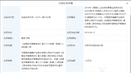 值得注意的是,运营商财经网还发现中国医药曾出现过提供虚假经济普查资料的问题。据天眼查信息显示,中国医药2018年《限额以上批发和零售业财务状况》(E603表)中“利息收入本年(3181)”指标上报数为657万元,但检查数为1708.6万元,差错率61.55%,构成提供虚假经济普查资料的违法行为。因此,北京市东城区统计局于2019年9月17日对其处以了警告并罚款1万元的行政处罚。