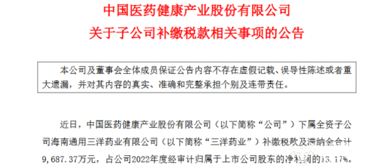 10月18日晚间,中国医药发布一则关于子公司海南通用三洋药业有限公司补缴税款的相关事项公告。内容显示,国家税务总局海南省税务局稽查局对三洋药业的涉税情况进行了检查,发现三洋药业需补缴2018年度至2020年度企业所得税6062.56万元及滞纳金3624.81万元,合计9687.37万元,相关款项三洋药业已完成缴纳。