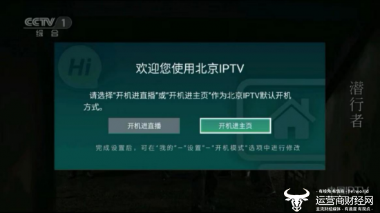 首次开机进入北京IPTV时将会直接进入到直播频道,同时屏幕弹出“开机进直播”和“开机进主页”的弹窗选项,您可根据自己的使用习惯进行选择。