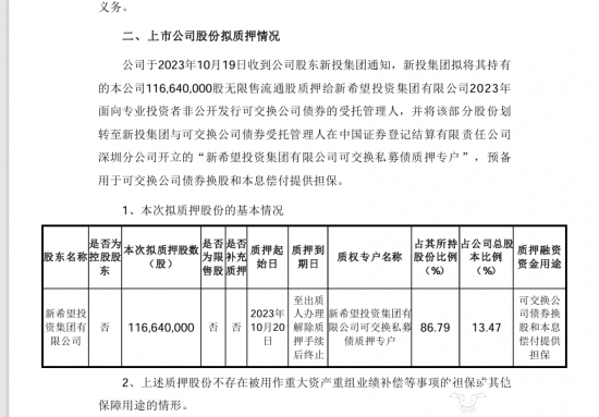 据公司10月20日公告显示,新投集团拟将其持有的公司116,640,000股无限售流通股质押给新希望投资集团有限公司2023年面向专业投资者非公开发行可交换公司债券的受托管理人,并将该部分股份划转至新投集团与可交换公司债券受托管理人在中国证券登记结算有限责任公司深圳分公司开立的“新希望投资集团有限公司可交换私募债质押专户”,预备用于可交换公司债券换股和本息偿付提供担保。