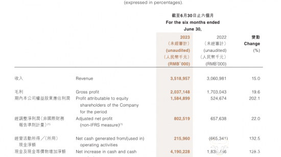 据公司上半年财报显示,上半年公司实现营业收入35.2亿元,同比增长15%;经调整净利润8.03亿元,同比增长22%。
