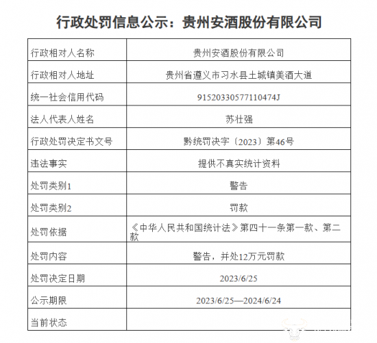 据贵州省统计局所公布的信息来看,安酒是因为存在提供不真实统计资料,从而被警告并处以12万元罚款,主要依据是《中华人民共和国统计法》第四十一条第一款、第二款。而据相关法律条文具体为:“(一)拒绝提供统计资料或者经催报后仍未按时提供统计资料的;(二)提供不真实或者不完整的统计资料的……企业事业单位或者其他组织有前款所列行为……情节严重的,并处五万元以上二十万元以下的罚款。”