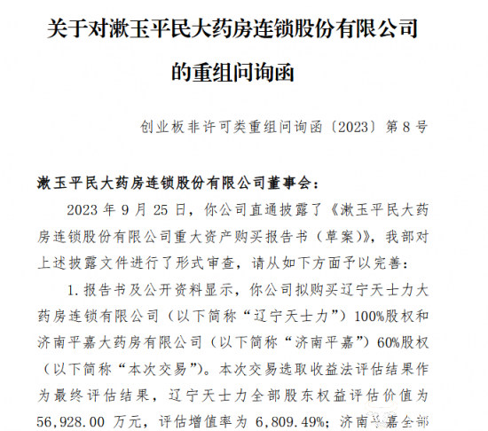 前不久,主营连锁药店的上市公司“漱玉平民”收购辽宁天士力的消息引发了行业关注。而没过多久,其“高溢价”收购的行为便遭到了深交所的问询,要求其说明在辽宁天士力评估增值率较高、交易对价全部采用现金支付、未设置业绩承诺和业绩补偿安排的具体原因及合理性等。