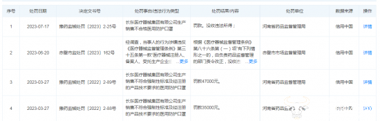 此外,天眼查显示,长东医疗自今年来已因生产不合格产品被处罚了4次,3月27日当天竟被处罚了两次,分别罚款4.7万及3.5万元。