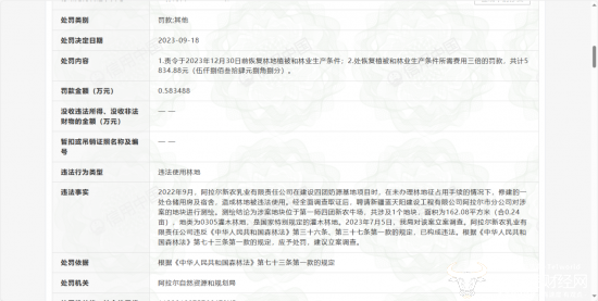 而在今年9月,该公司又被阿拉尔自然资源和规划局处罚0.58万元。原因是该公司在建设四团奶源基地项目时,在未办理林地征占用手续的情况下,修建的一处仓储用房及宿舍,造成林地被违法使用。