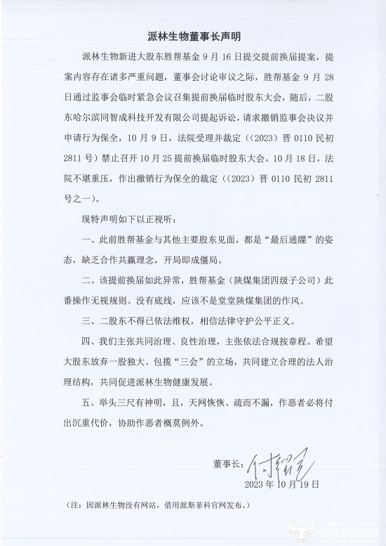 10月19日,付绍兰在公司官网发布声明,称胜帮基金提前换届的操作无视规则、没有底线,应该不是堂堂陕煤集团的作风;希望大股东放弃一股独大、包揽“三会”的立场,共同建立合理的法人治理机构,共同促进派林生物健康发展。
