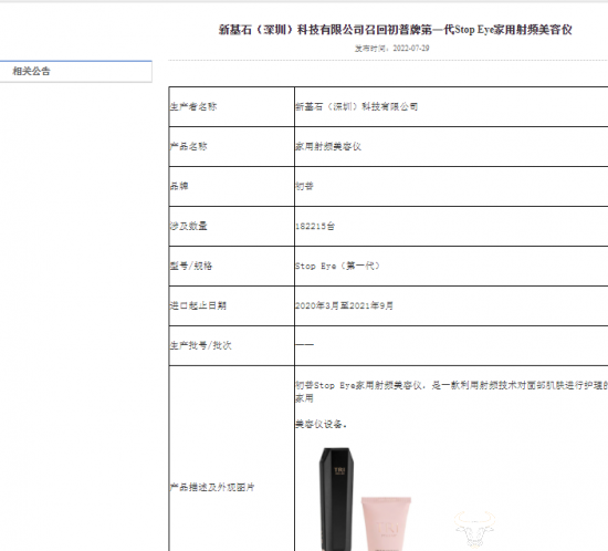 值得注意的是,在去年时,初普就曾陷因存在皮肤烫伤安全隐患被召回的舆论风波。据国家市场监督管理总局缺陷产品管理中心在当时发布的公告显示,新基石(深圳)科技有限公司代理的初普第一代Stop Eye家用射频美容仪,因温度设计问题及产品警示说明不足,如果在使用过程中长期停留在同一位置或过于缓慢移动时,可能出现设备探头温度过高的现象,极端情况下存在可能导致皮肤烫伤的安全隐患。