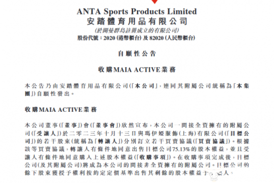 10月16日,安踏体育发布公告称,公司一间接全资子公司在10月13日与MAIA ACTIVE品牌公司玛伊娅的多个股东达成协议,将收购其75.13%的股权。收购完成后,玛伊娅服饰将成为安踏间接非全资拥有的子公司。