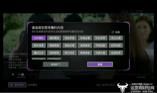 比如您选择了“动作冒险”,那这个频道从今以后就只会播像《碟中谍》、《速度与激情》……这些电影、电视剧,不用换台看到爽!