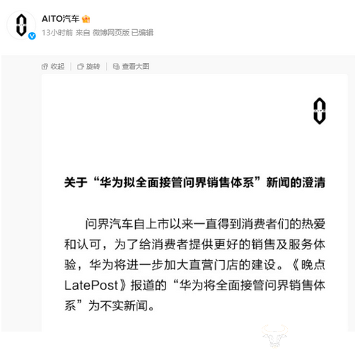 对此,问界官方账号“AITO汽车”发布澄清文章表示:媒体报道的‘华为将全面接管问界销售体系’为不实新闻。